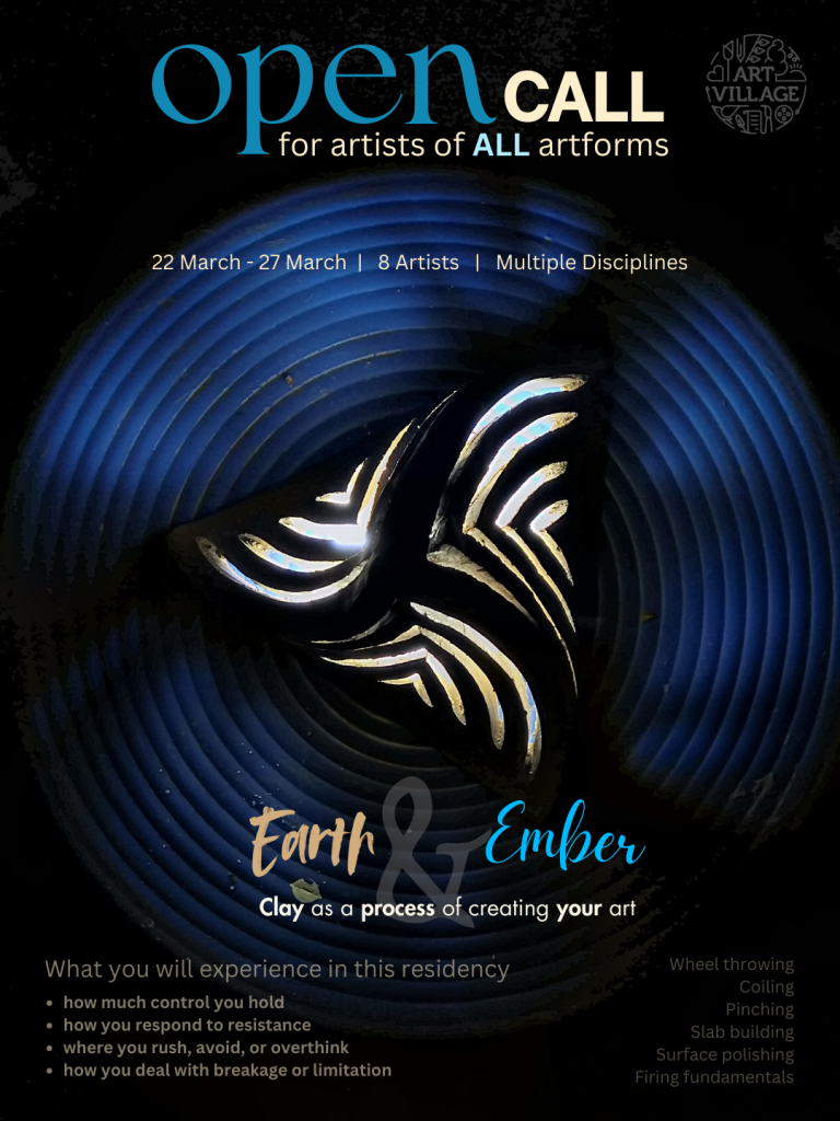 Art Village Karjat invites eight artists to Earth and Ember, a 5-day exploratory residency where clay becomes the medium of making and the catalyst for expression. This residency is designed for artists from any discipline to immerse themselves in the tactile, grounding world of clay—while simultaneously creating an artwork in their own primary medium (movement, sound, literature, paint/print, mural, theater, etc).